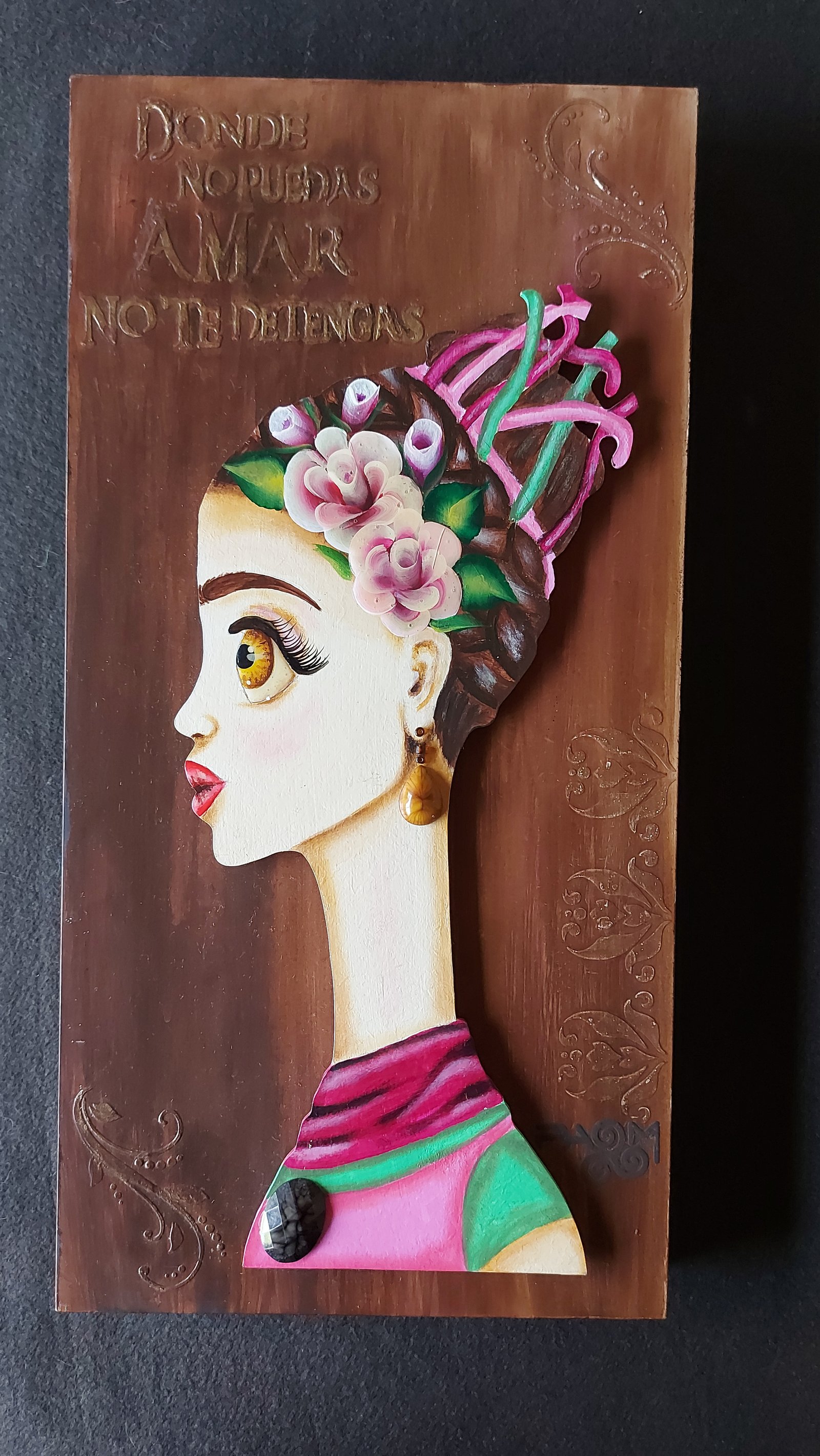 Cuadro realizado sobre bastidor de fibrofácil de 25x50 cm, con aplique de figura cortada en madera, acrílicos y técnicas mixtas.